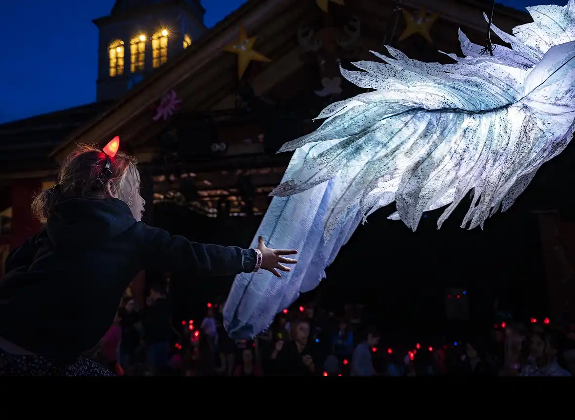 Oiseaux de plus de 3 mètres d’envergure, lumineux (auto éclairés), suspendus à une canne à pêche de 5 mètres de long.