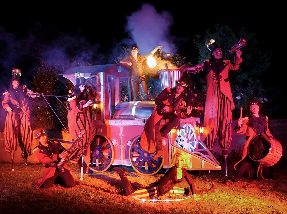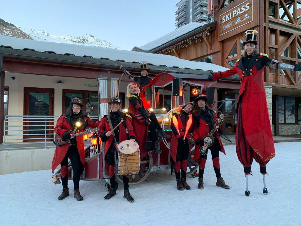 Spectacle déambulatoire et/ou fixe festif et burlesque, inspiré de l’univers «steampunk» et des écrits de Jules Verne. Les Voyageurs, personnages fantaisistes et colorés, ne sont ni en avance ni en retard, ils arrivent toujours à point nommé et au bon endroit pour le plaisir de tous.