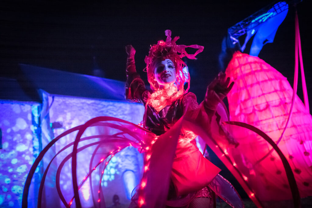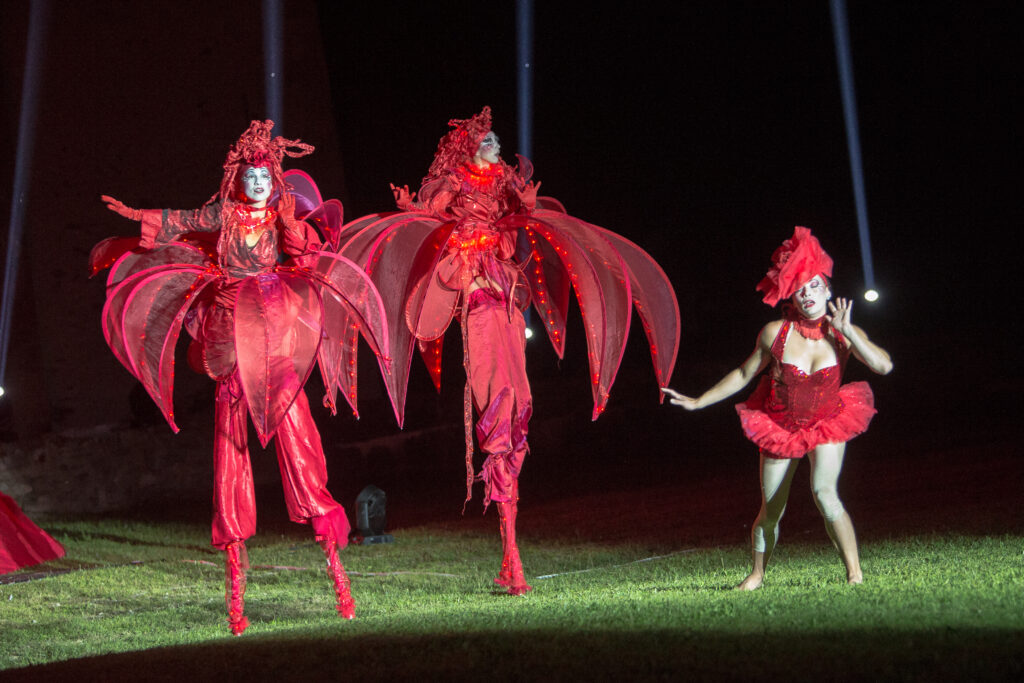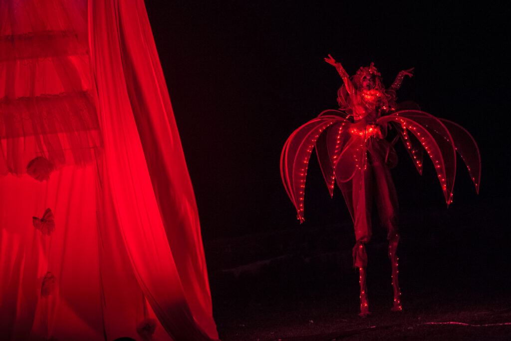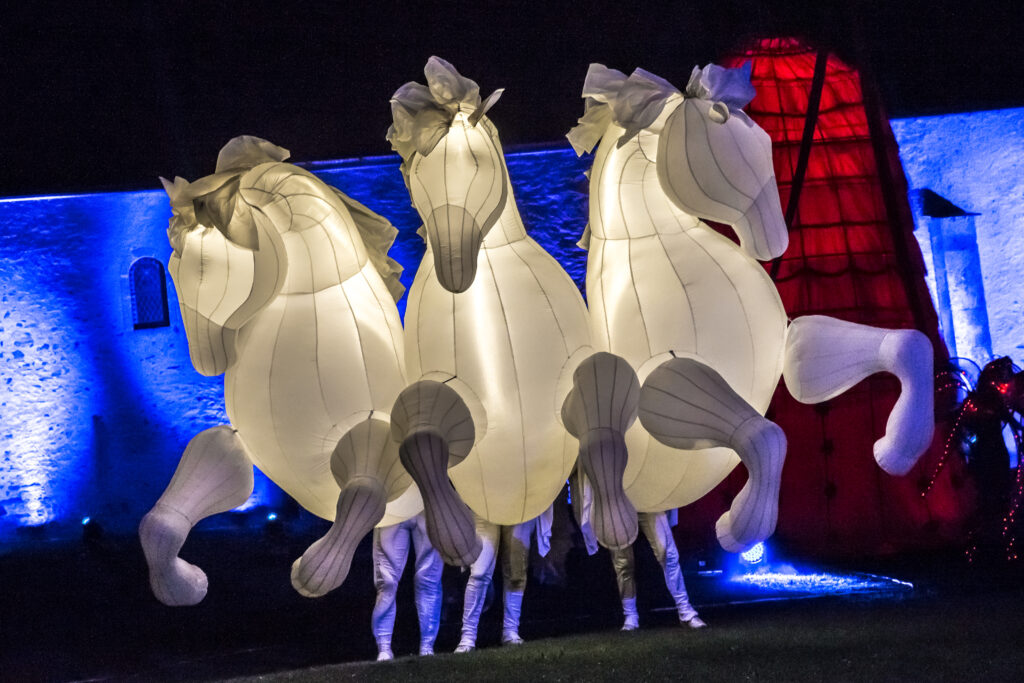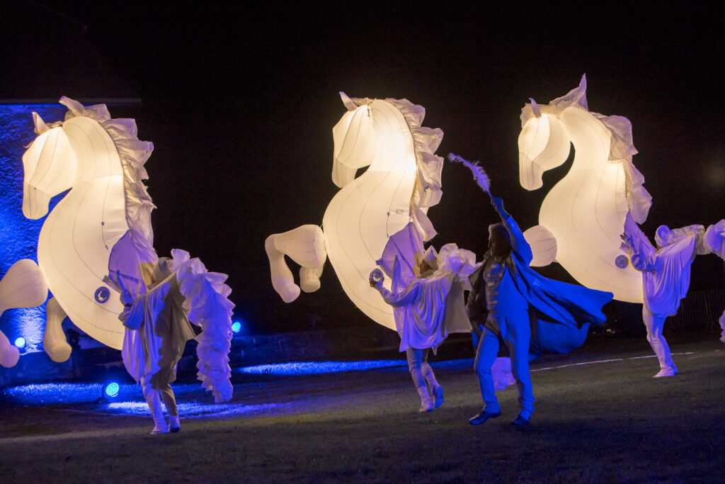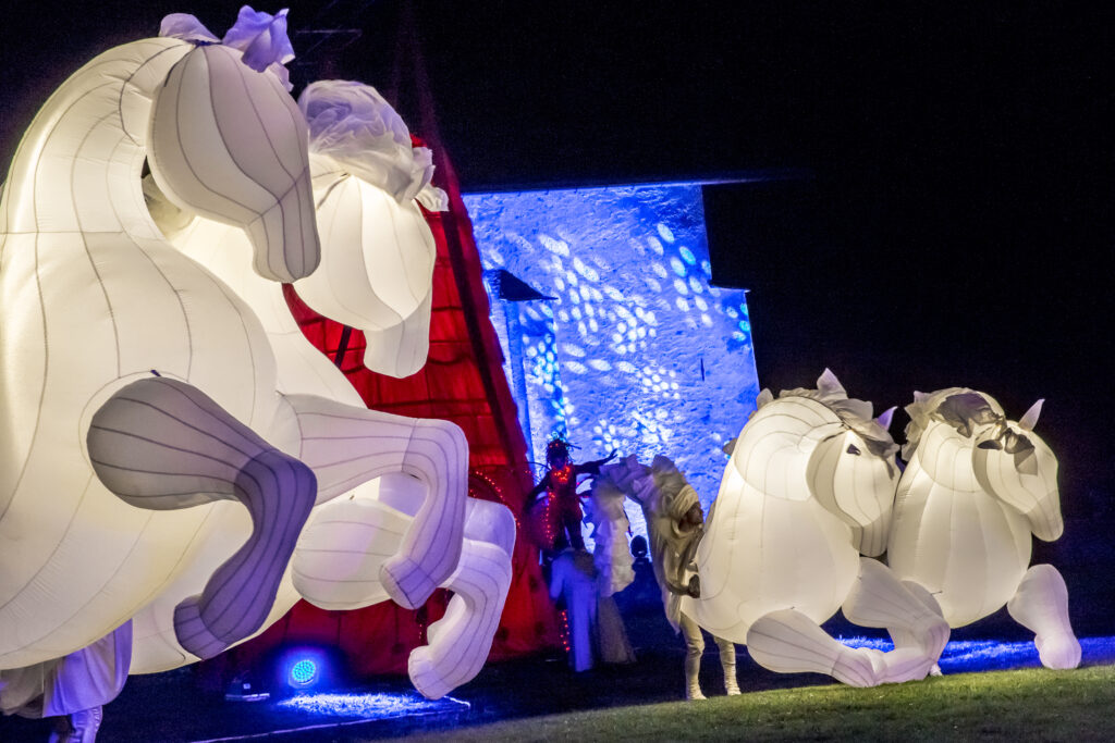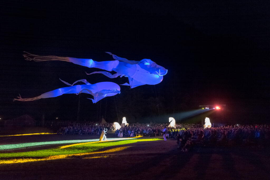… des personnages légendaires mi-homme mi- chevaux qui se transforment en chevaux gigantesques et lumineux, un Homme des pistes pour dompter cette parade équestre et onirique et des Luminéoles géantes qui planent de toute leur majesté sur ce tableau féerique.